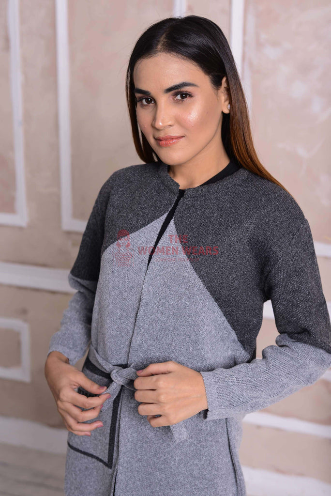 Imported Front Open Regent Grey & Dark Grey Cozy Belted Cardigan Sweater - (CGN55)