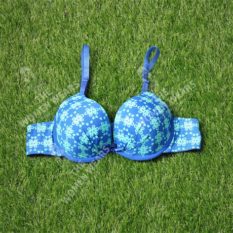 Full cup wire bra with padding. The interior cups create a rounded shape and center the breasts naturally. The thin, double straps can be worn crossed in the back.